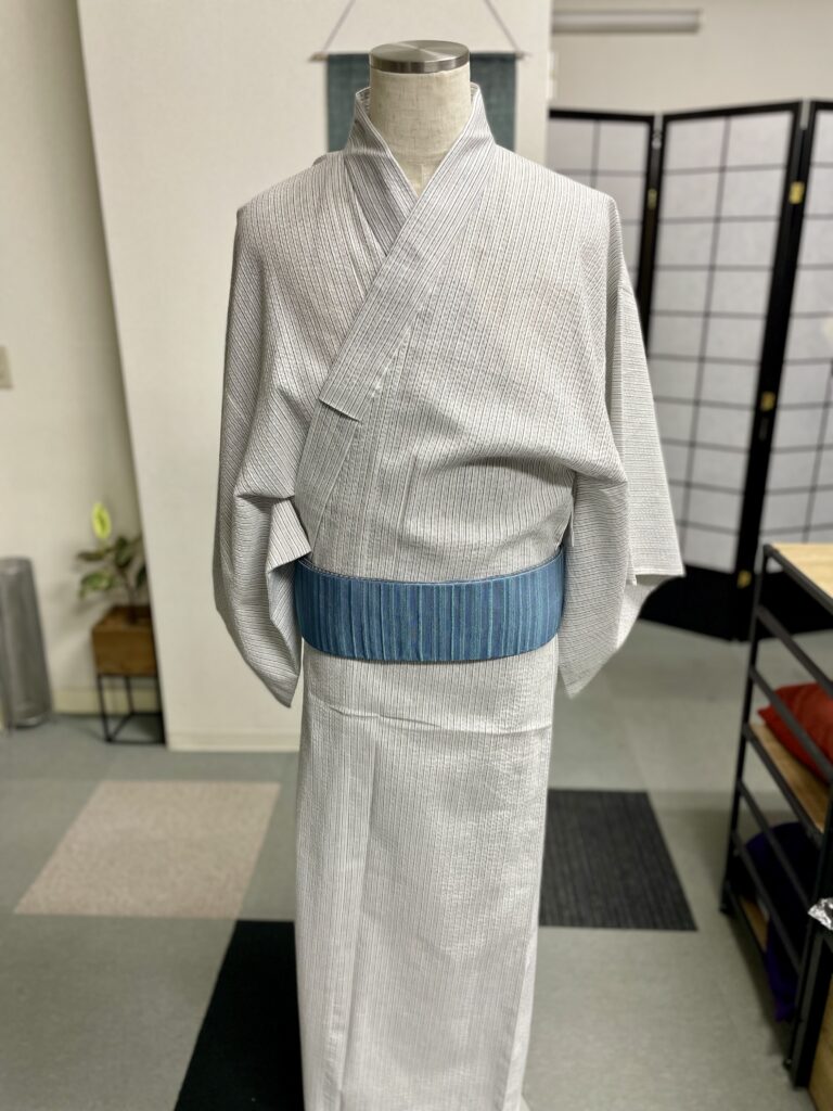 無地に近いグレーがかった白の浴衣に少しくすんだ青の角帯の組み合わせです。