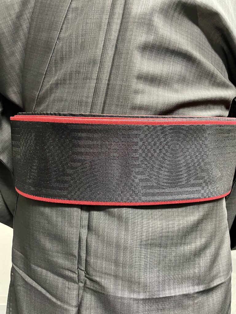 「西の西陣、東の桐生」と言われるくらい、群馬県桐生市は織物の産地です。絹をはじめ、化繊も織られています。こちらの角帯も桐生で織られた化繊の角帯になります。